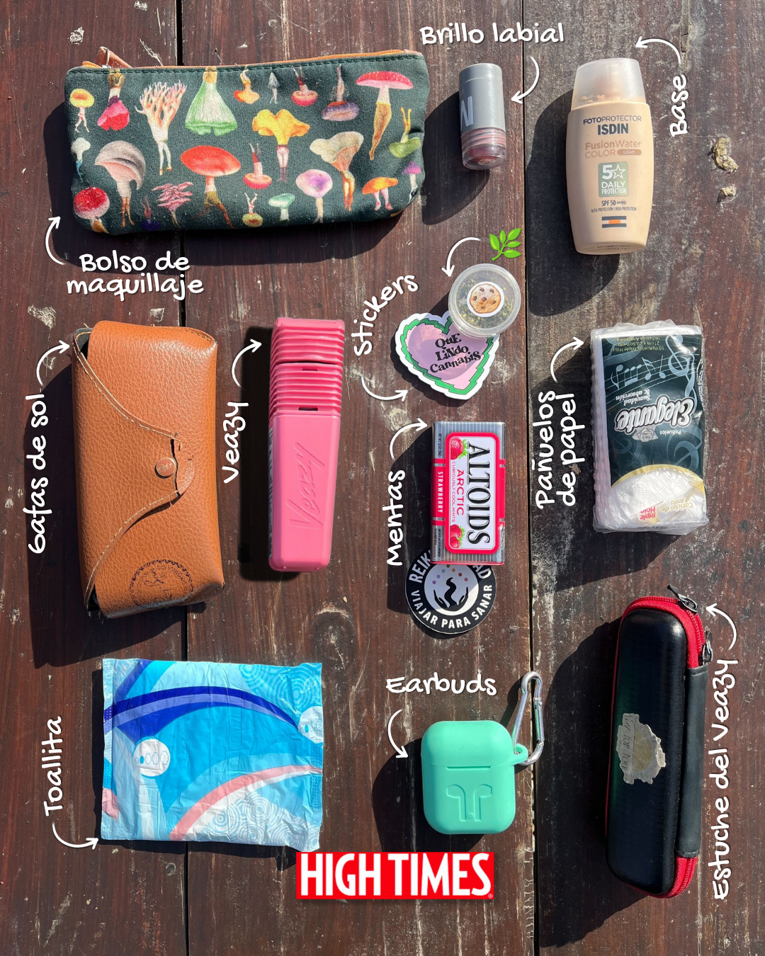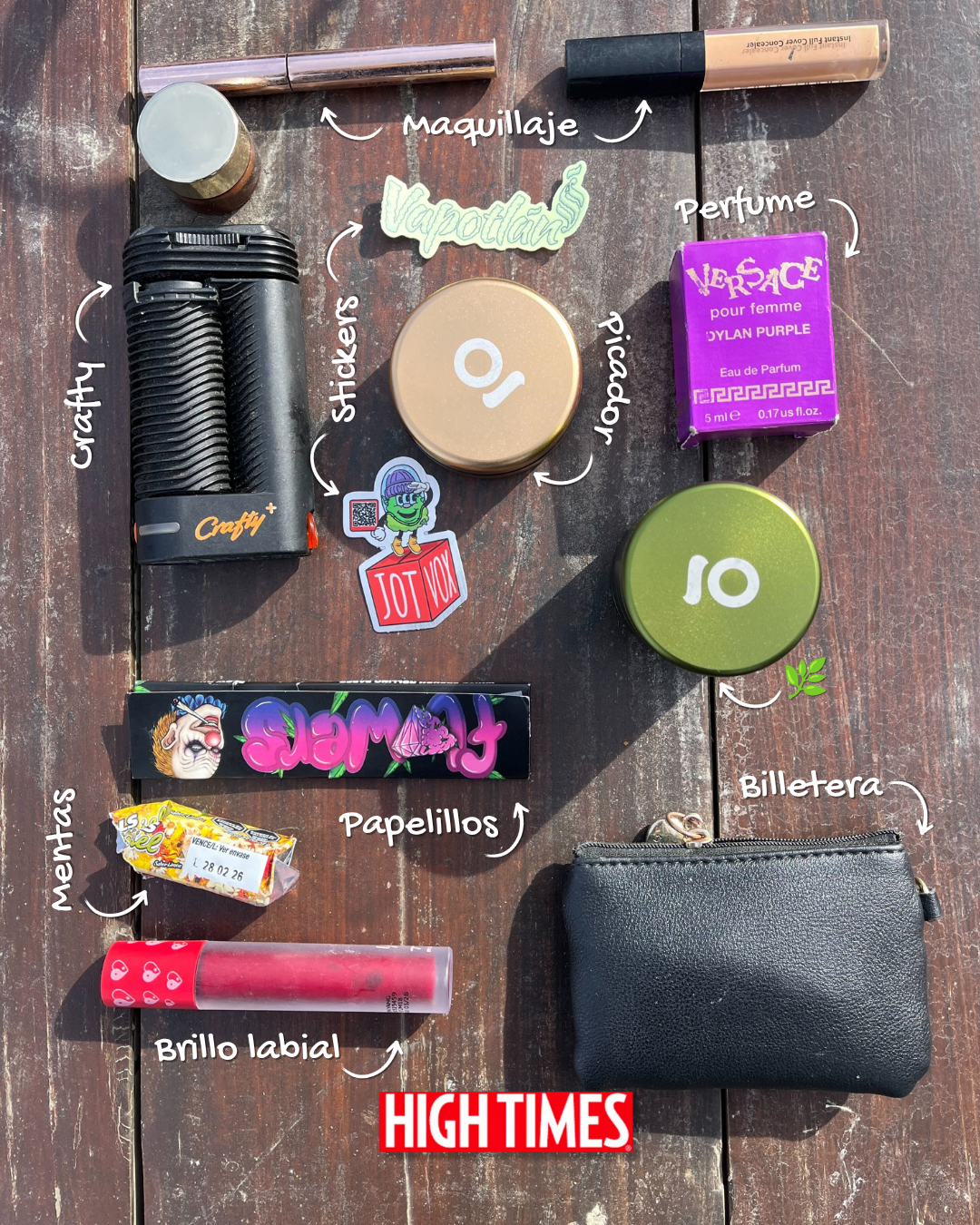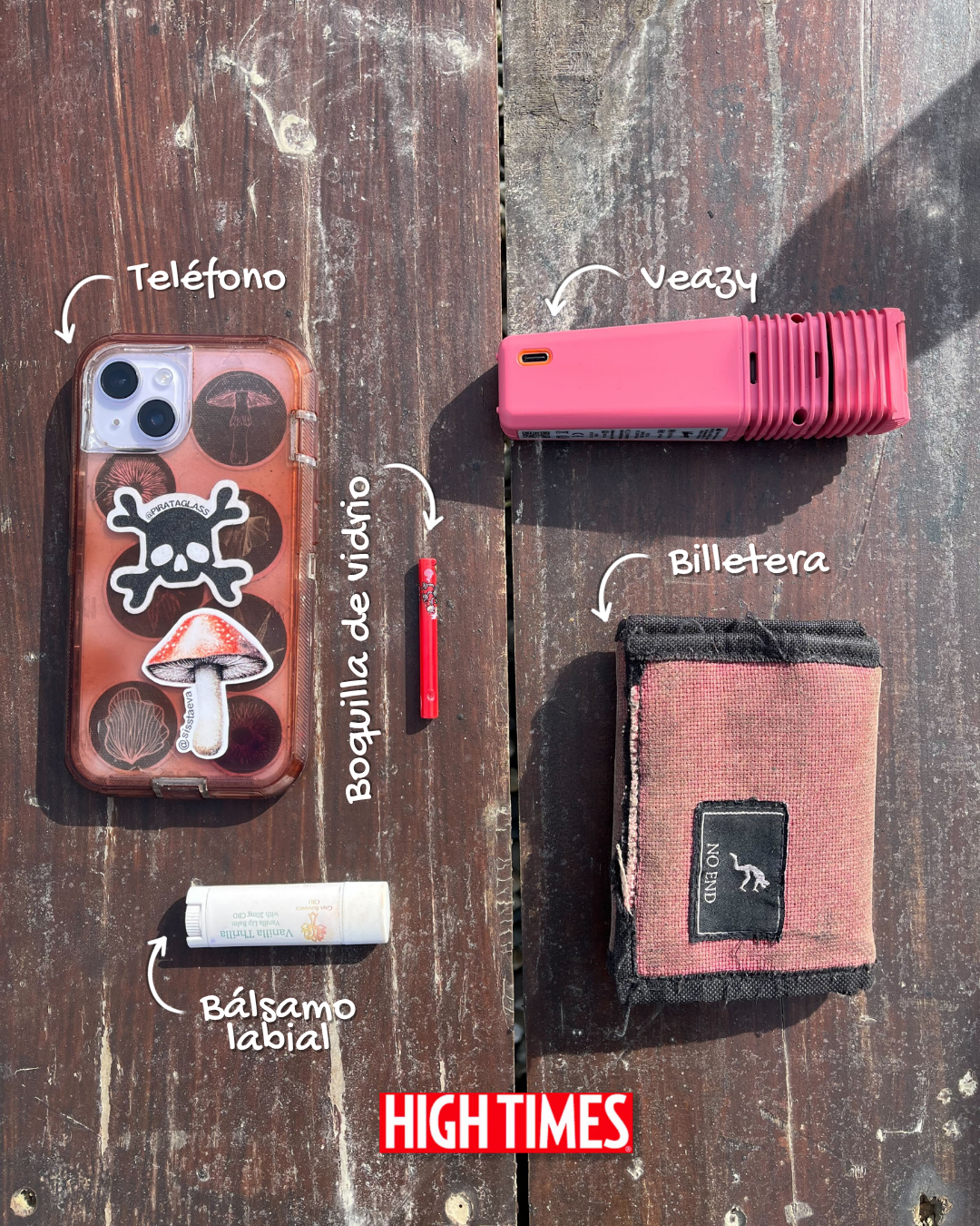 Esencial(es): “No salgo sin mi vape —por reducción de daños— y mi grinder, para que todo sea más fácil y bonito. Y claro, mi hierba”.