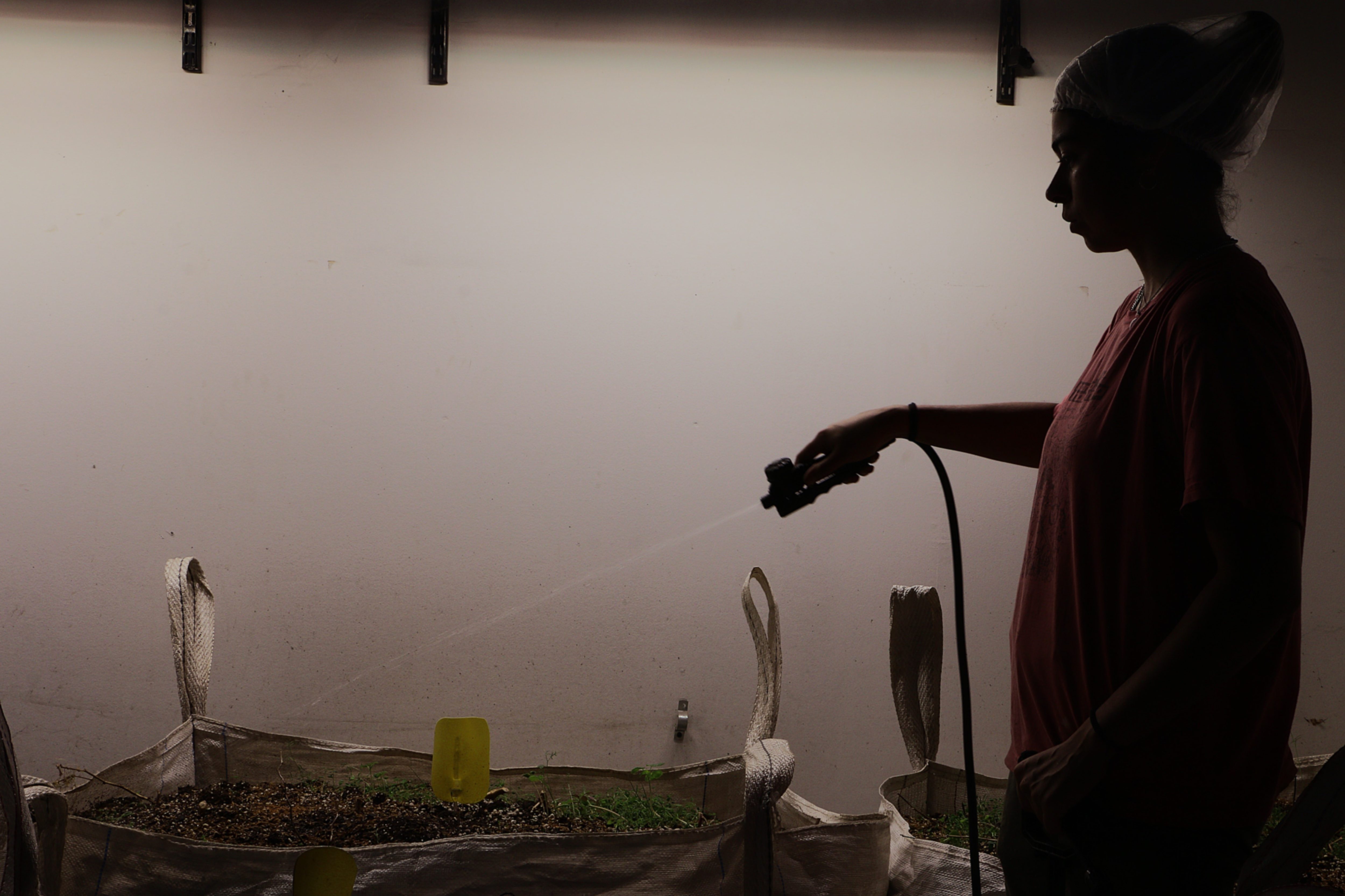Al costado del espacio de reciclado de suelo hay una cortina de plástico. Al traspasarla, se observa un cartel sobre una puerta metálica con inconfundibles indicios: sala de vegetación. Pero antes de ingresar en este espacio intermedio hay que desinfectarse rociándose alcohol diluido en agua y se deben colocar cofias en la cabeza. Borgo cuenta que esta práctica les redujo las plagas que pueden invadir las plantas, sobre todo, en las épocas de calor.