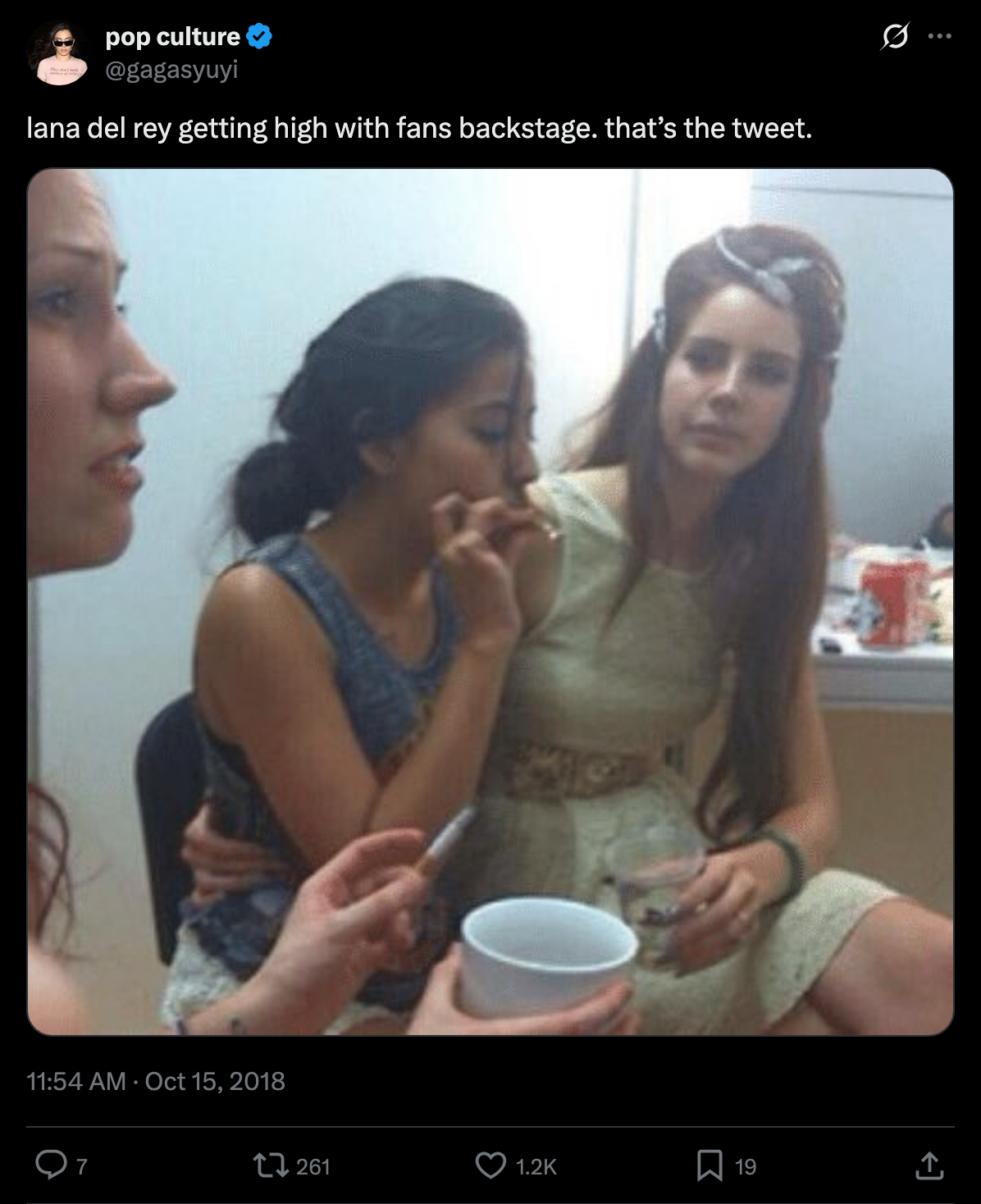 Del Rey canta mucho sobre drogarse, así que la pregunta es: ¿alguien la ha visto fumar weed en público?