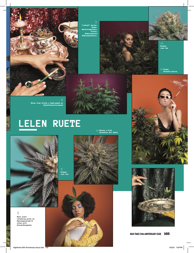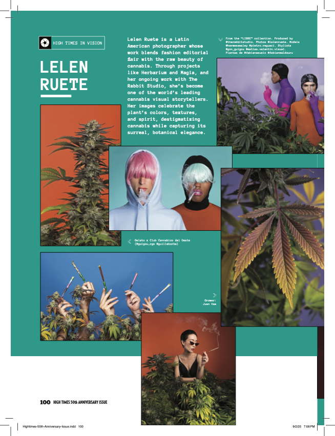 Lelen Ruete es una fotógrafa latinoamericana cuyo trabajo combina el espíritu editorial de la moda con la belleza cruda del cannabis. A través de proyectos como Herbarium y Magia, y su trabajo continuo junto a The Rabbit Studio, se ha convertido en una de las principales narradoras visuales del cannabis a nivel global. Sus imágenes celebran los colores, las texturas y el alma de la planta, desestigmatizándola mientras capturan su elegancia botánica y surreal.
